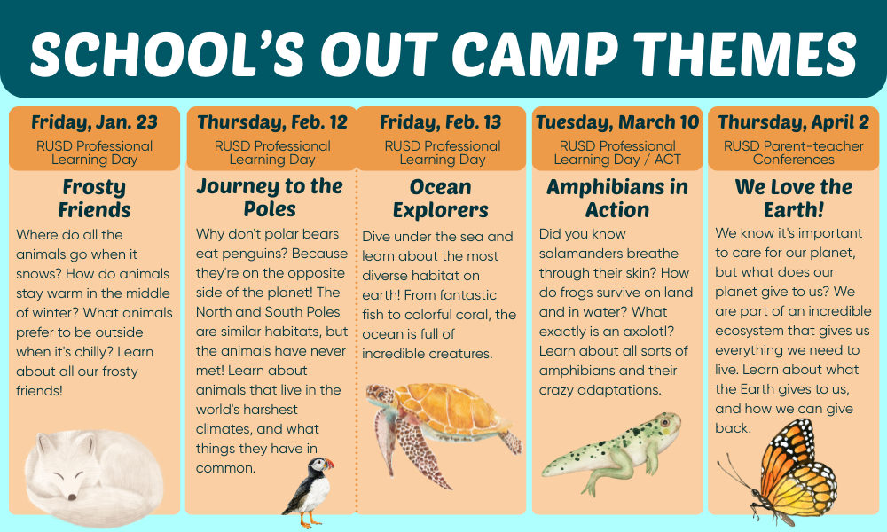 Camp runs from 9:00am-4:00pm on select RUSD Professional Learning Days. See the themes below for available days.